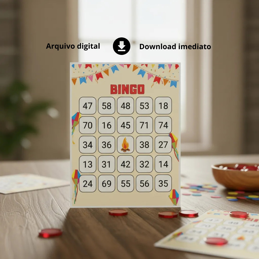 Este é um produto digital. Você receberá os arquivos exclusivamente via e-mail. NÃO serão enviadas cartelas físicas de bingo via transportadoras para a sua casa. Uso pessoal apenas; é proibida a revenda ou distribuição dos arquivos.