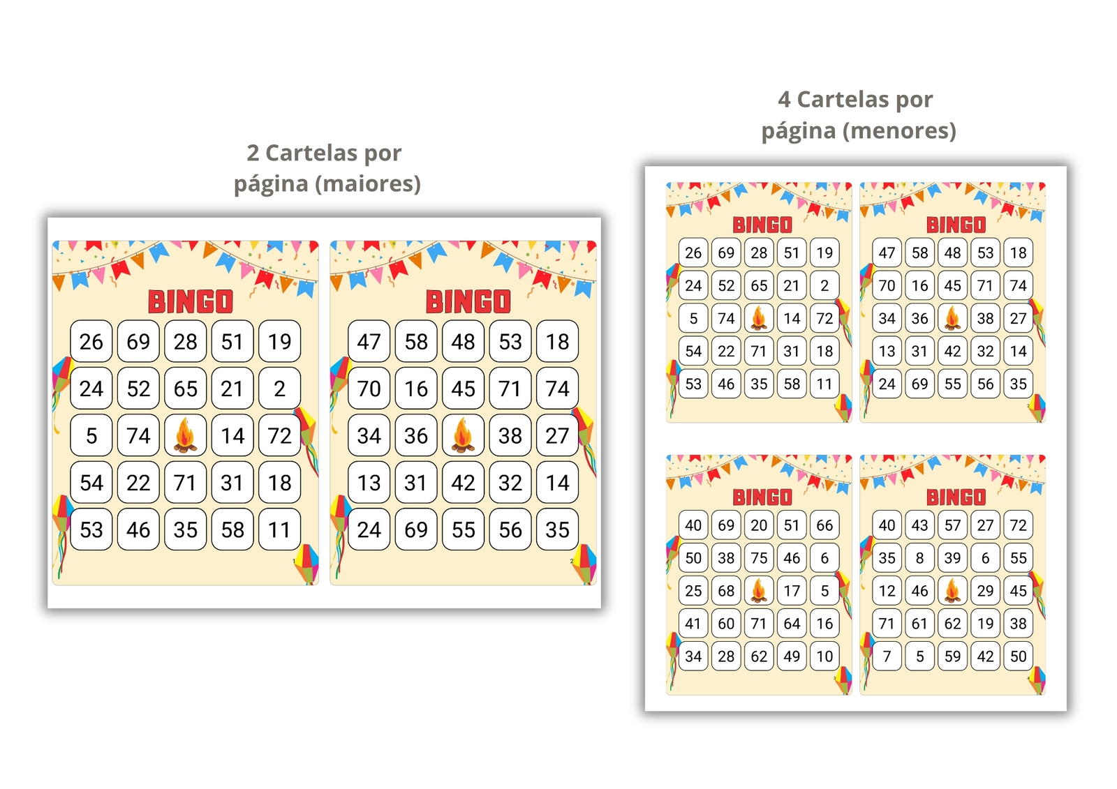 - Cartelas de bingo ( duas opções disponíveis para você escolher: 2 cartelas por página ou 4 cartelas por pagina).