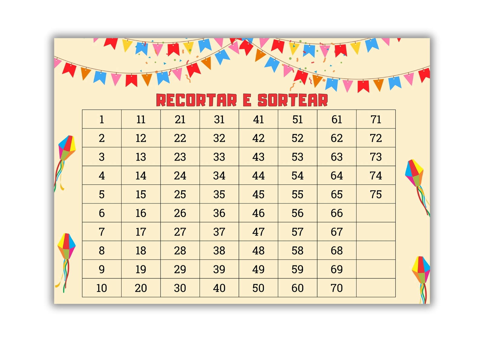- Folha com números para recortar e sortear + folha de controle para acompanhar o jogo.