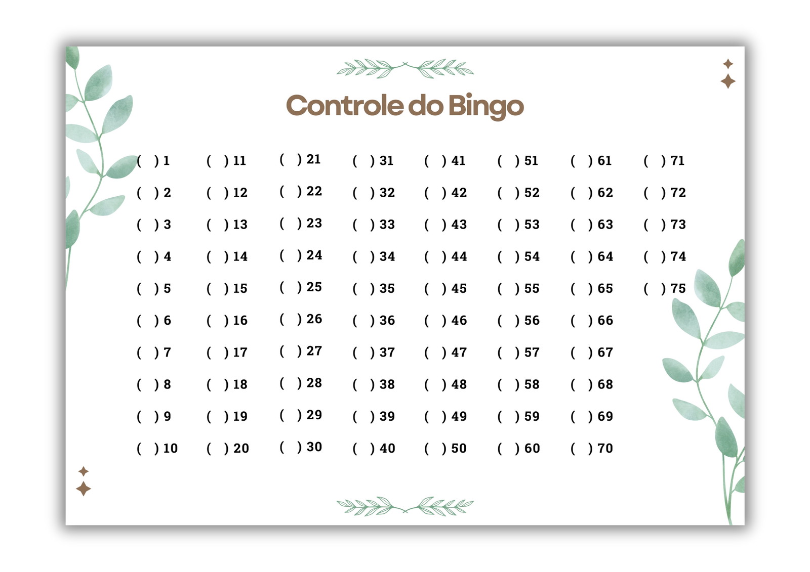1. Imprima as cartelas, a Folha de Números para Sorteio e a Folha de Controle do bingo.