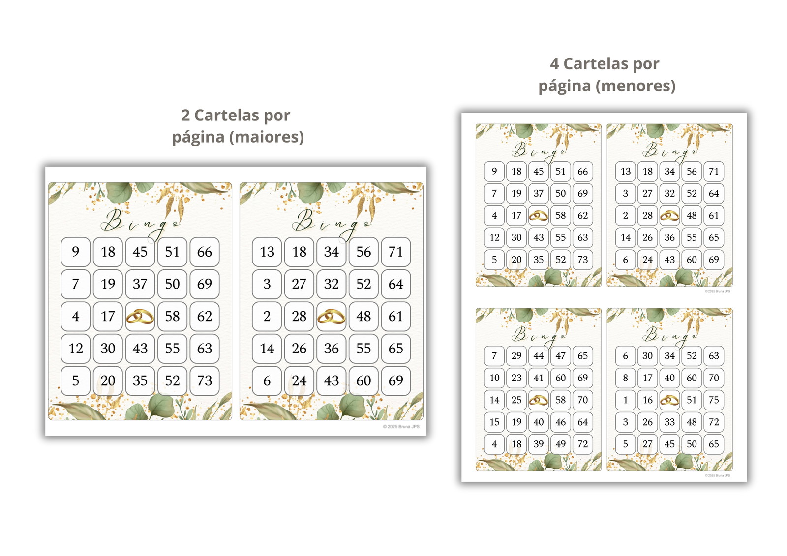 - 150 cartelas de bingo (Duas opções prontas para você escolher: 2 Cartelas por página ou 4 Cartelas por página)