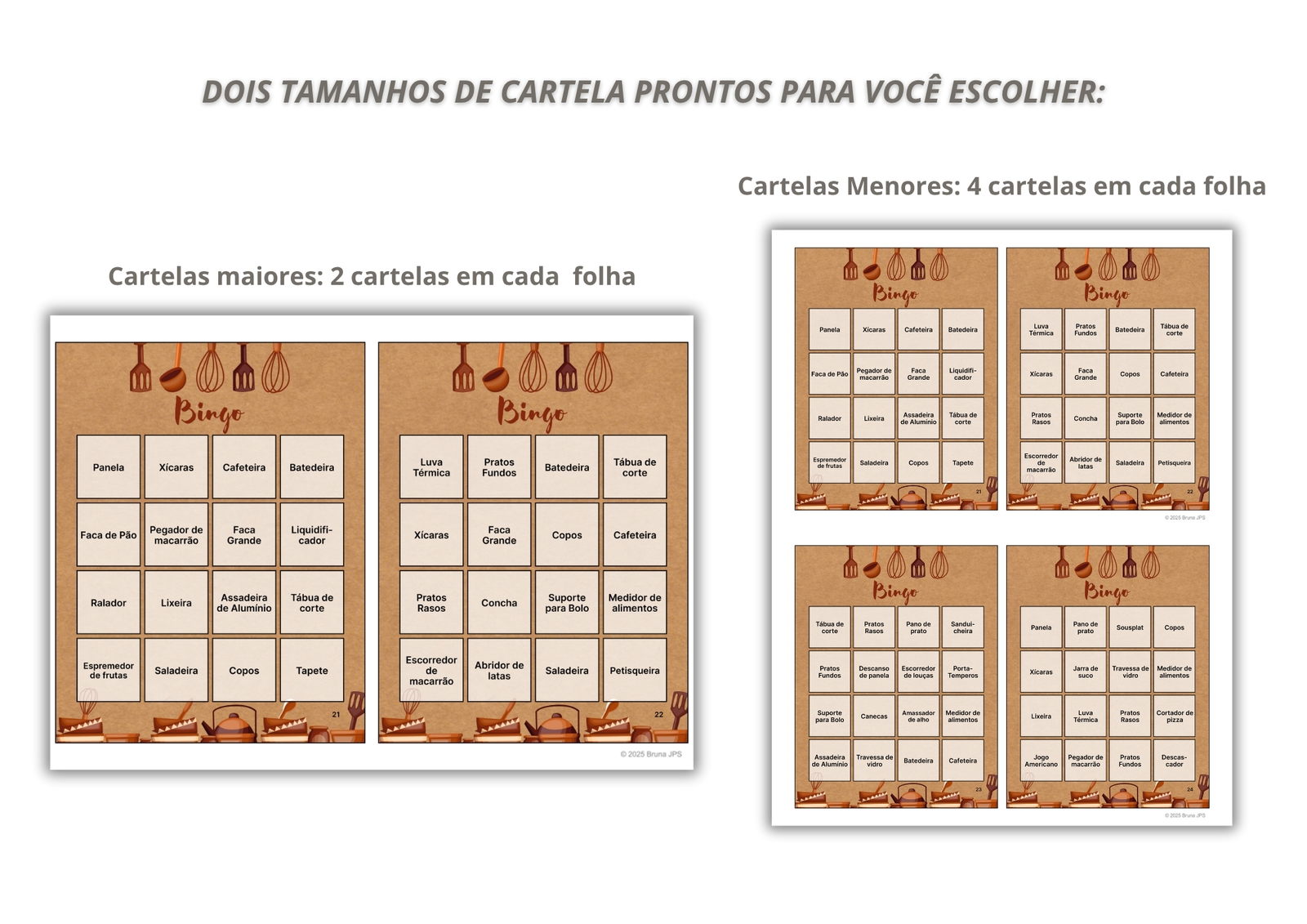 - Cartelas de bingo ( duas opções disponíveis para você escolher: 2 cartelas por página ou 4 cartelas por pagina).