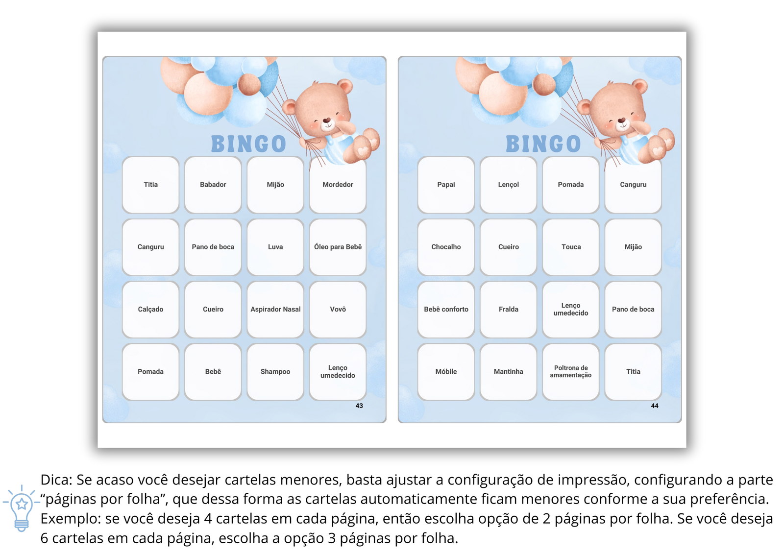 3. Distribua as cartelas entre os convidados. (Lembre-se de cortar as cartelas, pois são duas por página.)